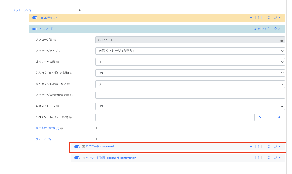 - 追加した【パスワード】フォームを、【パスワード確認】フォームの前になるように並び替える調整を行なってください。