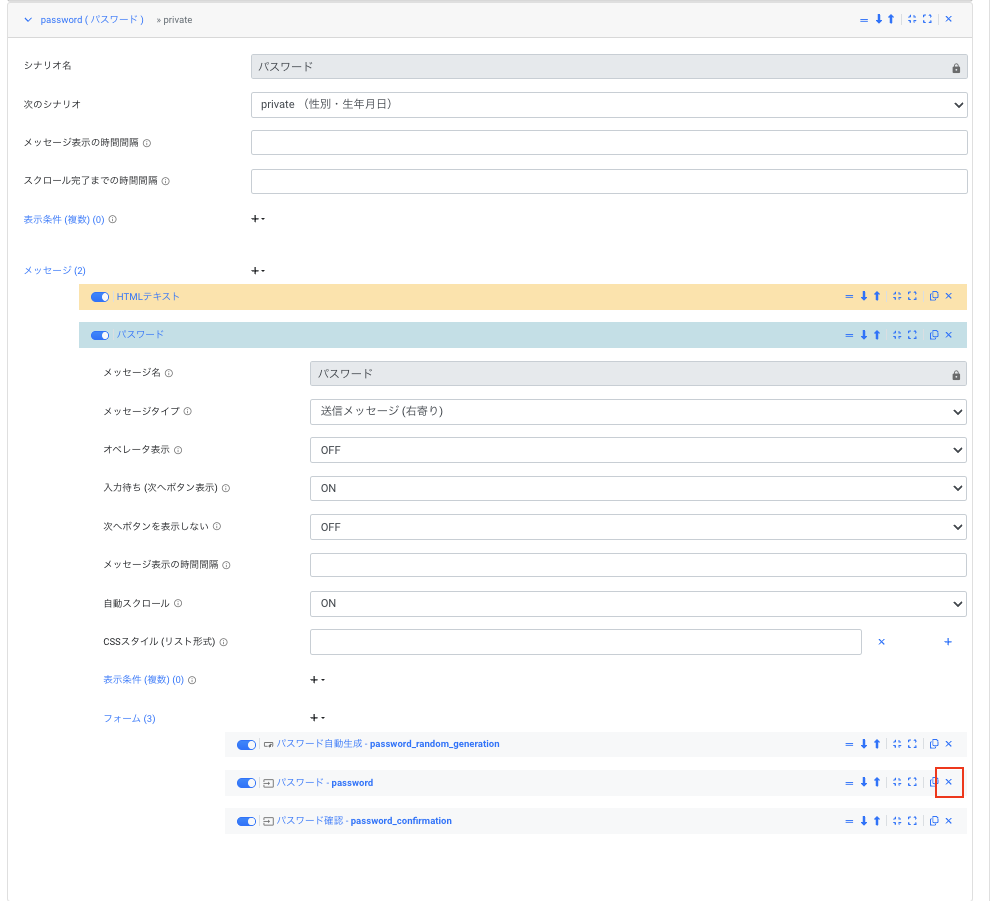 - 任意のプロファイル編集画面にアクセス後、シナリオ設定の【 password( パスワード)】>【パスワード】の【 パスワード - password】フォームを削除します。